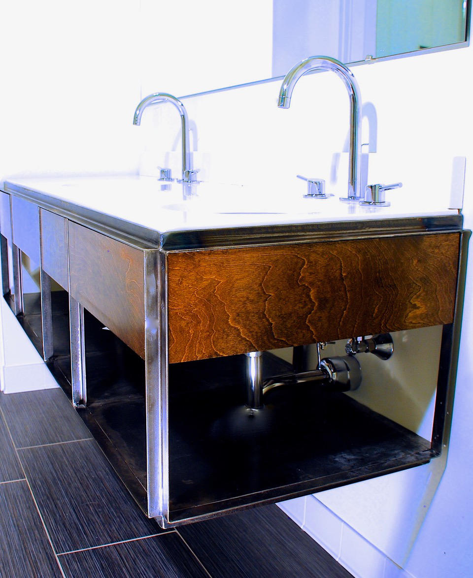 Before providing a quote we need specifications on your sink and on your plumbing requirements. Available are matching mirror holder, light fixtures, further cabinets; and combinations with molten glass artwork made by us in a collaboration with Emerald Glass Art in Pittsburgh; LED light installations; electrical outlets for, e.g. shaver, hair dryer, or sound systems.