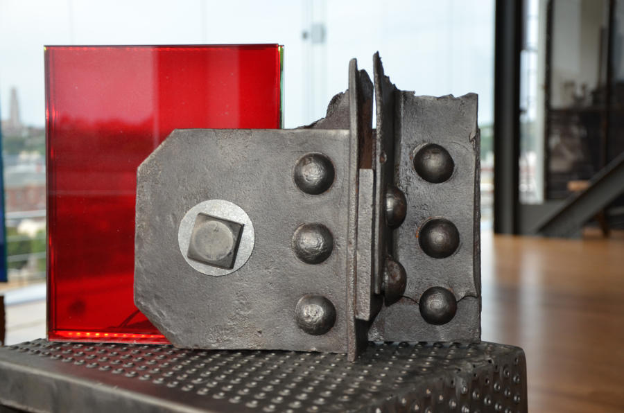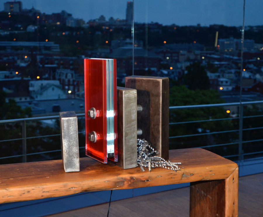 Jörg used the principle of car safety glass to develop a glowing color feature for light sculptures. With Emerald Glass of Pittsburgh they fabricate triple glass sheets with polished edges and laminate stage light color sheets in between using high temperature vacuum chambers. High-power LED strips are integrated on the bottom edge between the three sheets and radiate though and out of the sides of the three layer, by optical light refraction at the varioius planes within. Steel construction principles that we found on old Pittsburgh bridges guided us to connecting heavy steel irons. An special detail is the holes drilled into the beam structure, a detail that we found on a bridge, to accomodate further beams of a bridge construction. We believe that these holes add to the overall substantial appearance of the 1/4" steel beams. This very heavy piece is thought to be placed freestanding on the floor. We use 5 feet tall glass sheets but we can arrange for other custom made sizes, e.g. to enable placing the pice on a platform. The steel is blow torched, welded and grinded; the nuts and bolts heavy industrial grade; and the steel surfaces are power wire brushed and waxed. The steel surface can alternatively be rusted. For the color of the glass we picked a very dark navy blue, but you could ask for custom colors - please see the one photo with color examples of similar pieces. 110V power supply included. Transport of this heavy pieces requires special arrangements.